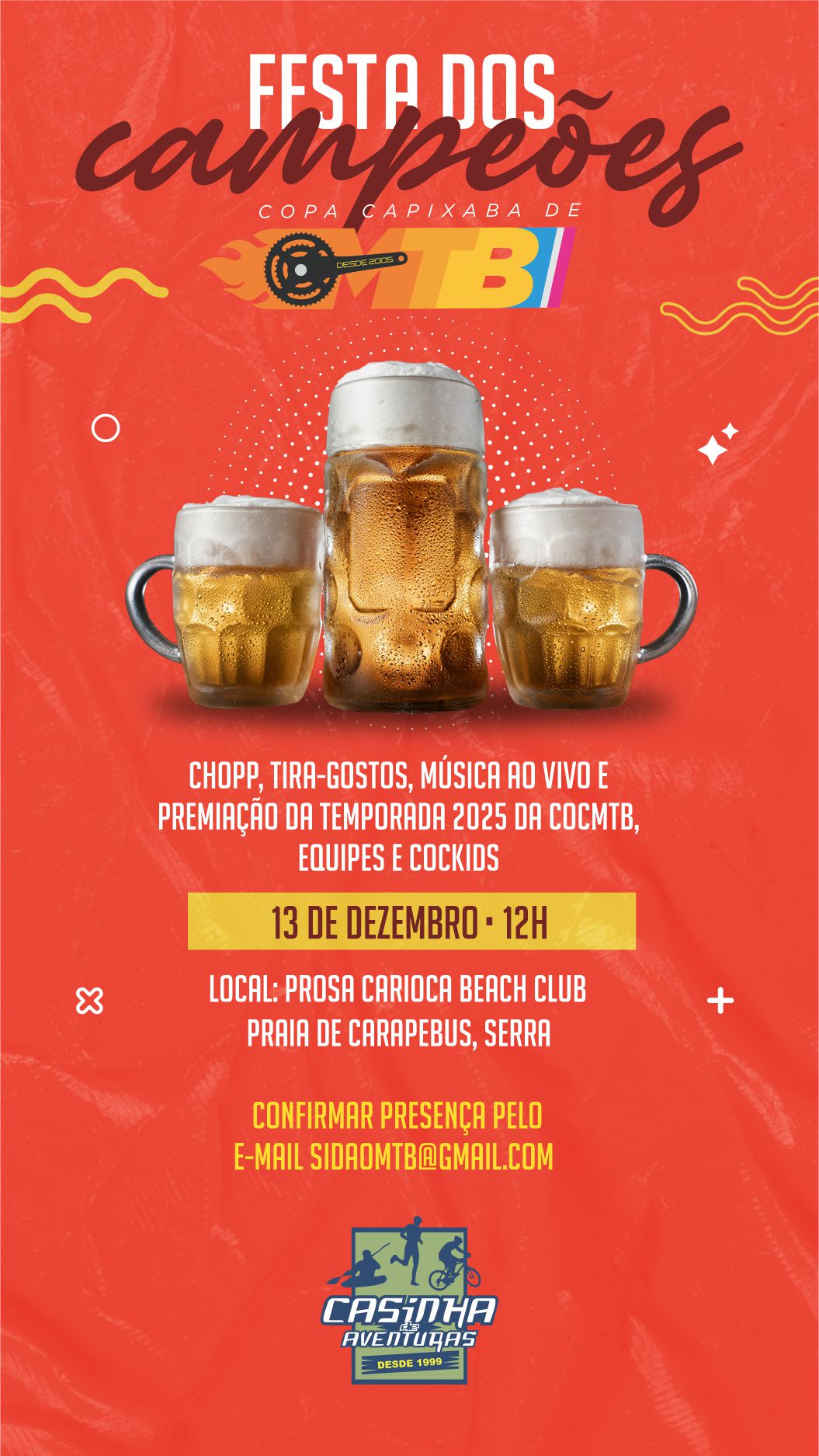 A 7ª etapa da COCMTB 2025 será na verdade uma grande festa de comemoração que acontecerá no dia 13 de dezembro no balneário de Carapebus na Serra onde além de descontrairmos com aquela resenha do ano, estaremos entregando a premiação da temporada de todas as modalidades, veja abaixo como vai funcionar.